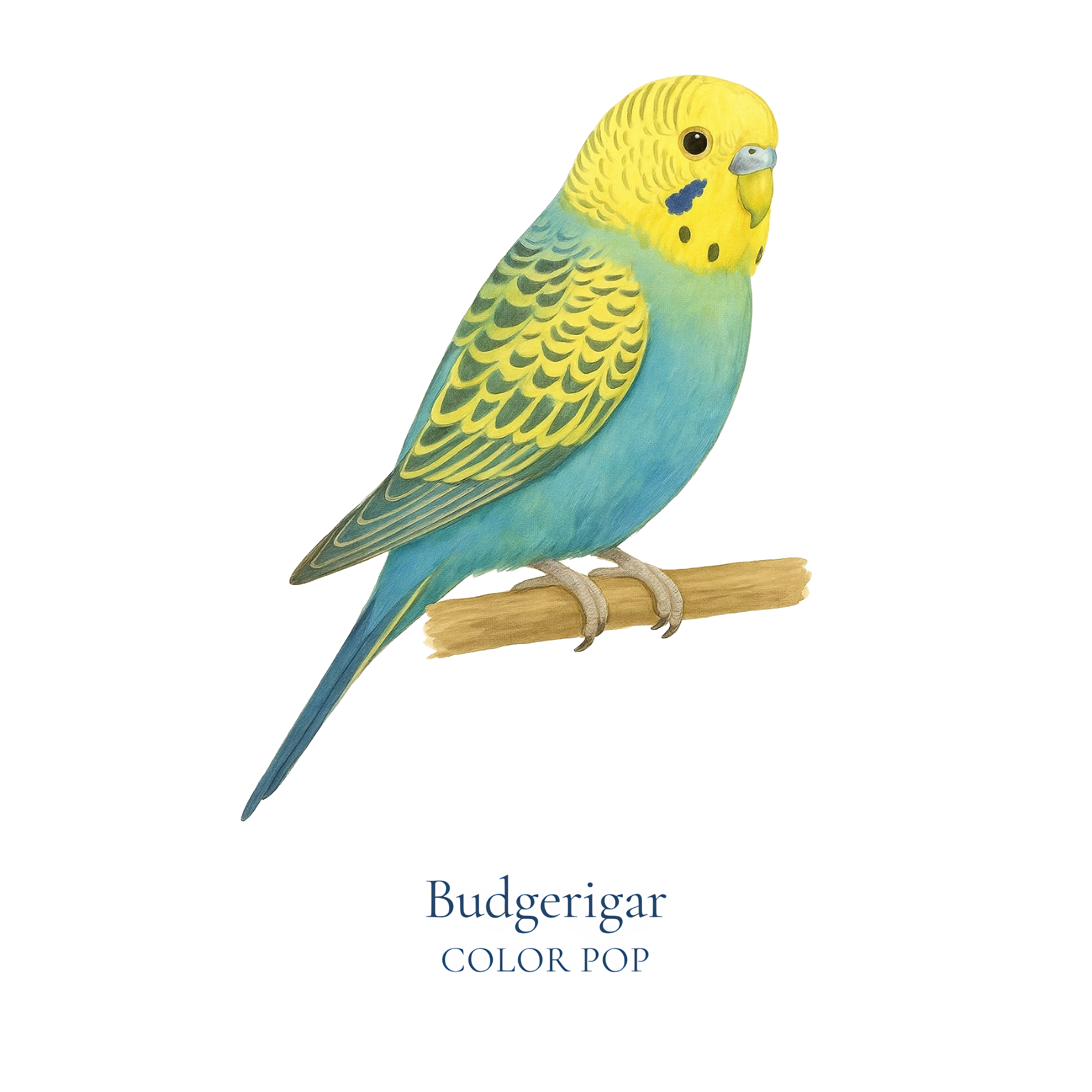 止まり木の上で静かにたたずむ、色とりどりのコンパニオンバードたち。