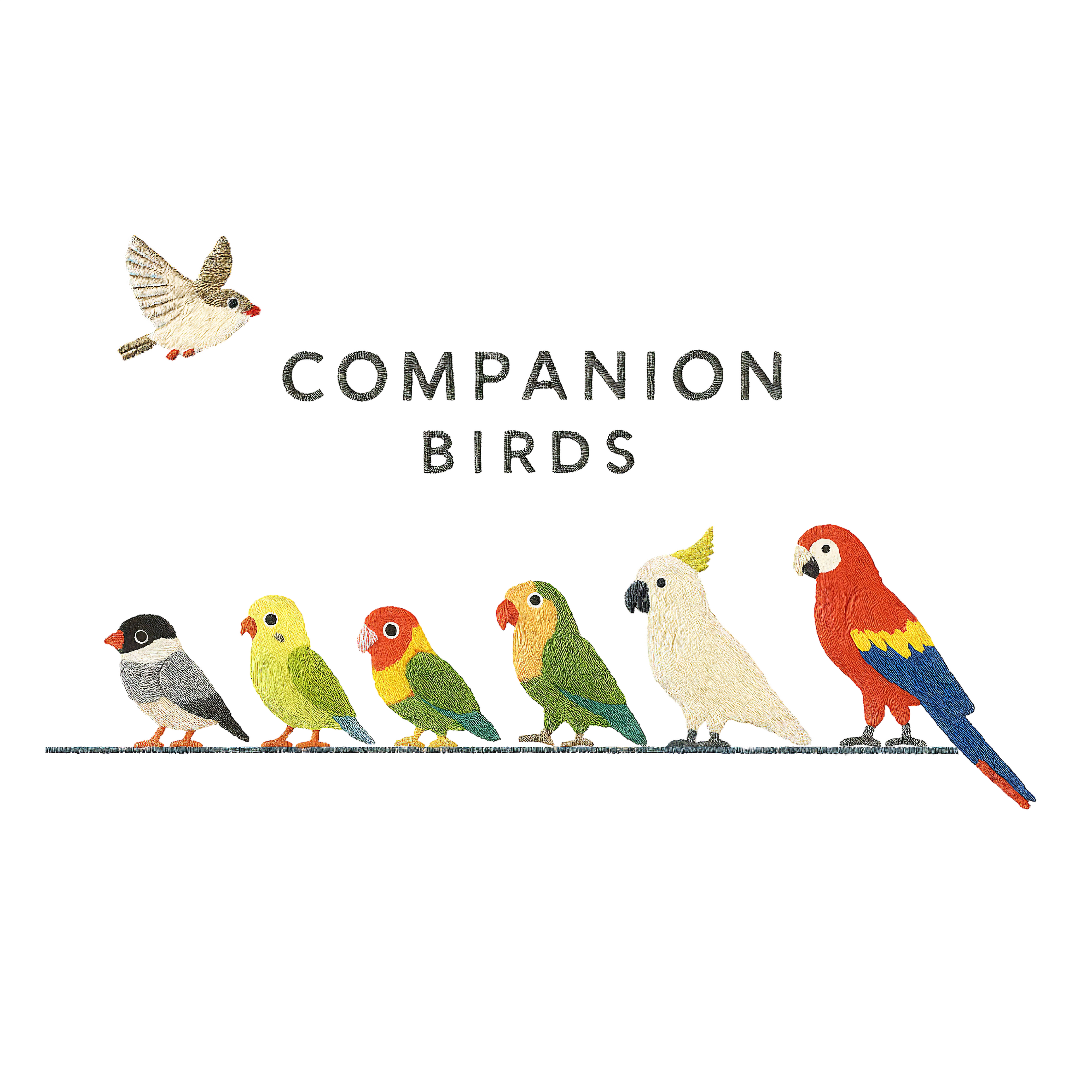 刺繍風タッチで描かれた小鳥たちが横に並び、羽色のコントラストがやさしく日常にとけ込みます。